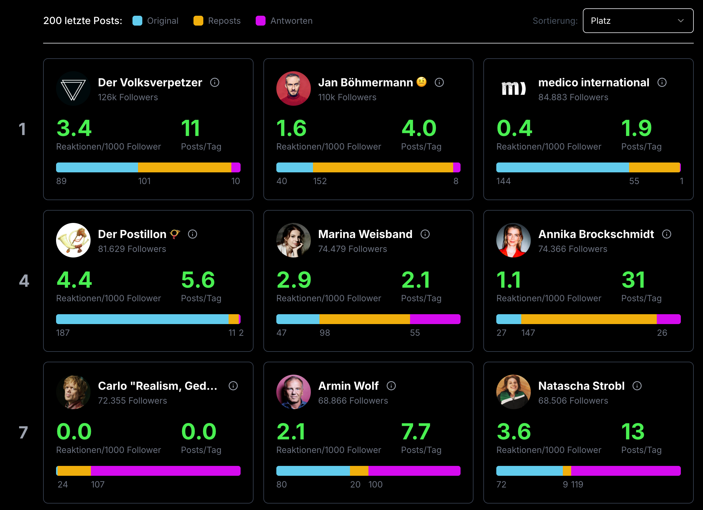Voilà, hier ist die Liste der 100 meistgefolgten deutschsprachigen Accounts, die in den vergangenen 14 Tagen etwas gepostet haben: Sie ist als Google-Spreadsheet und als Liste bei Bluesky verfügbar. Aus den Daten ist auch eine interaktive Visualisierung entstanden. Oben seht ihr einen Ausschnitt davon. Anhand des farbigen Balkens pro Account, der die letzten 100 bis 200 Beiträge repräsentiert, zeigt sich, ob der Account als Lautsprecher (reine Verbreitung), Multiplikator (viele Reposts) oder mitteilungsbedürftig (viele Antworten bzw. lange Threads) agiert. Pro Account könnt ihr in der Visualisierung ein generiertes Porträt aufrufen. Die Auswertung durch ein Large Language Model aller 100 Porträts lässt sich unten vollständig lesen. Das Fazit des LLM Claude Opus 4.5 lautet: